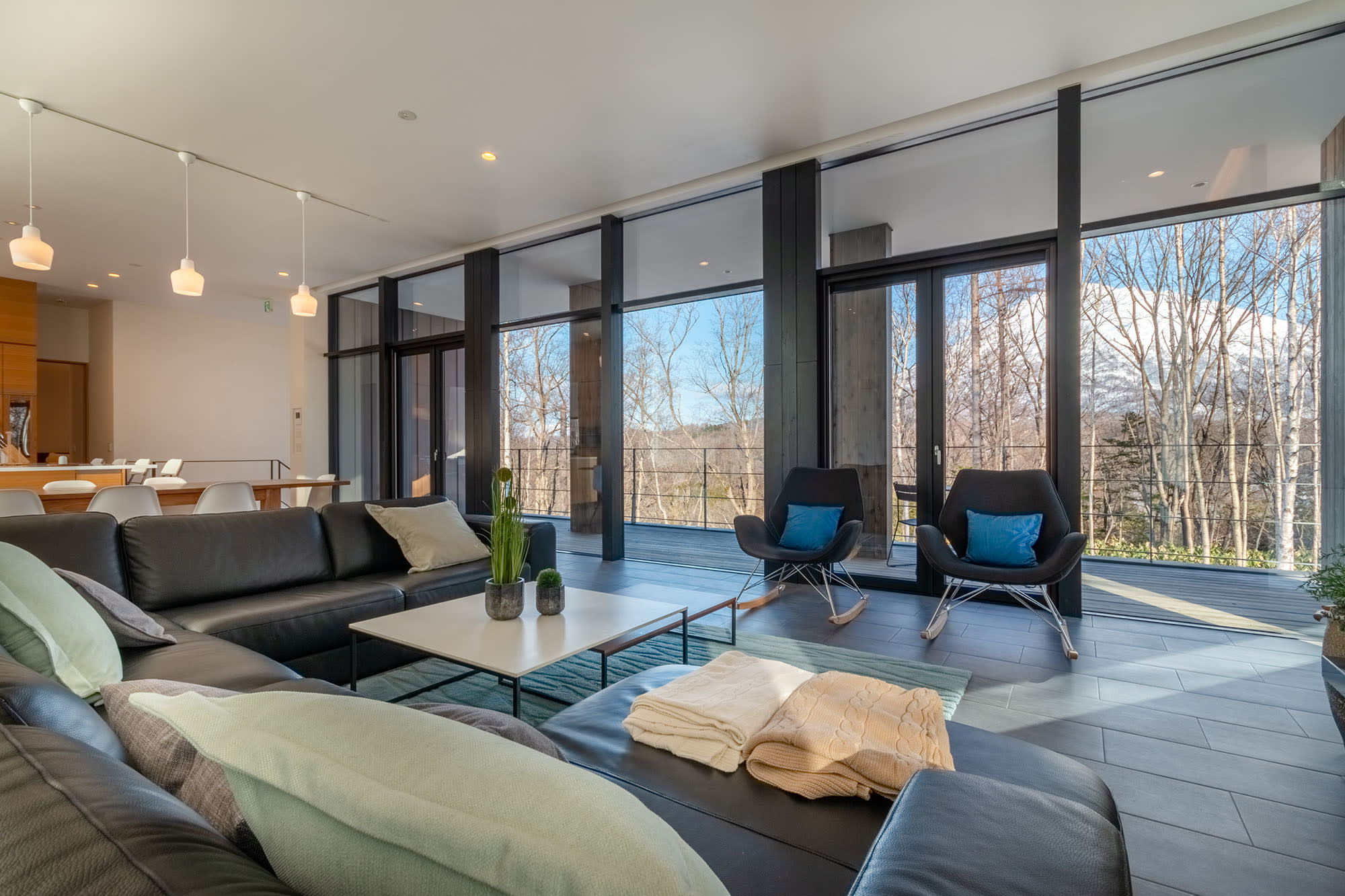 ひらふ地区の郊外に位置するヤナギハウスは、広い空間をお求めのご家族連れに最適な別荘です。ひらふ中心部から2.5キロの距離にあり、4つのベッドルームと3つのバスルームを備え、美しい木々の中で他の追従を許さないプライバシー空間と静けさを提供します。挑戦的なほどにモダンな建築は、札幌の建築家‧小西彦仁氏と彼の事務所の優秀な頭脳によって設計され、2016年に福島建設によって完成されました。直線が生きた、シャープで鋭角なデザインは、森の中において、インパクトのある外観を際立たせています。リビングの床から天井までの窓は、季節のうつろいとともに変化する森の美しさを遮るものなく映します。